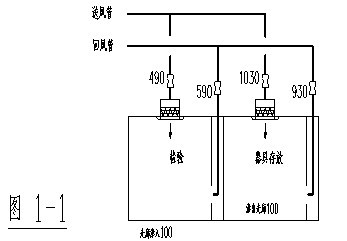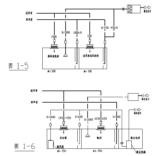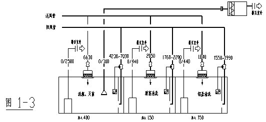 4.5 對(duì)于需房間全排風(fēng)的房間,若工藝設(shè)備不運(yùn)行時(shí),可以回風(fēng),如器具清洗間、潔具清洗存放間,可以在房間送風(fēng)支管上裝定風(fēng)量閥,在排風(fēng)支管上裝定風(fēng)量閥,電動(dòng)密閉閥,在房間回風(fēng)支管上裝定風(fēng)量閥,電動(dòng)密閉閥,房間排風(fēng)時(shí),排風(fēng)支管上電動(dòng)密閉閥開(kāi),房間回風(fēng)支管上電動(dòng)密閉閥關(guān),房間排風(fēng);房間不排風(fēng)時(shí),房間回風(fēng)支管上電動(dòng)密閉閥開(kāi),排風(fēng)管上電動(dòng)密閉閥關(guān),房間回風(fēng)。如圖1-5。